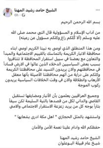 شيخ البو علوان "يغمز" مثنى السامرائي: يريدون ركوب الموجة مع قدوم الانتخابات