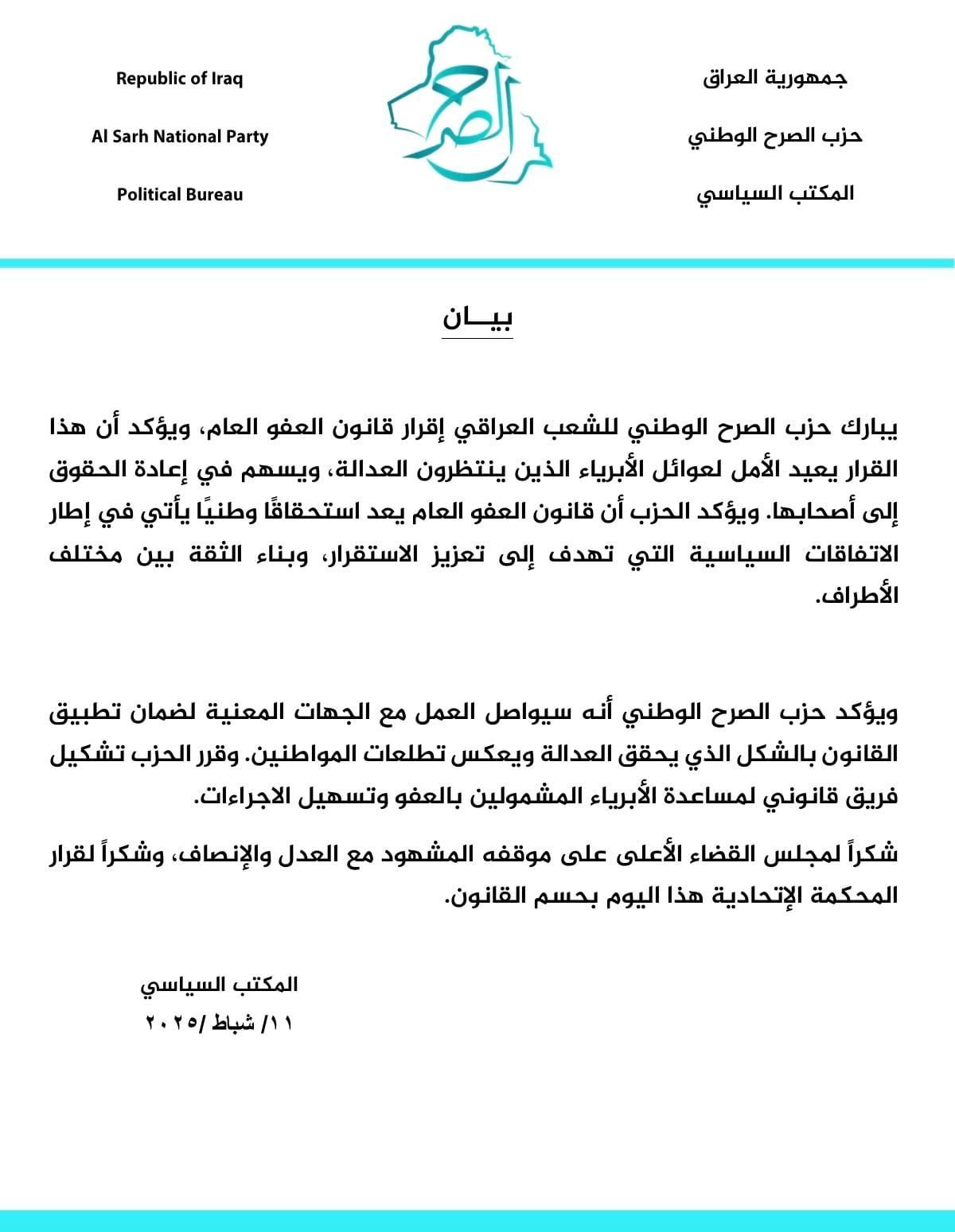 الرئيسية/حزب الصرح الوطني يبارك رفع "الأمر الولائي" عن قانون العفو العام/ترحيب بالعفو الوطني ترحيب بالعفو الوطني